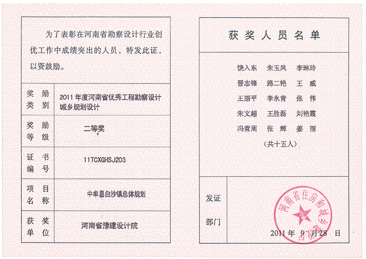 中牟縣白沙鎮(zhèn)總體規(guī)劃獲獎證書-2010.2011-公司榮譽