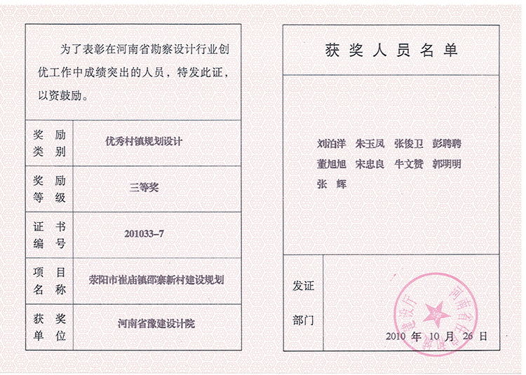 滎陽市崔廟鎮(zhèn)邵寨新村建設(shè)規(guī)劃獲獎證書-2010.2011-公司榮譽