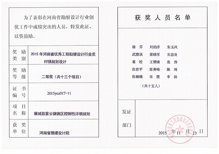 紫云鎮(zhèn)區(qū)控制性詳細規(guī)劃獲獎證書-2015年獲獎證書-公司榮譽