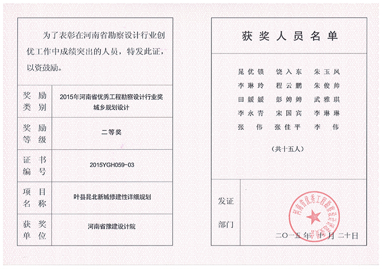 葉縣昆北新城修建性詳細(xì)規(guī)劃獲獎證書-2015年獲獎證書-公司榮譽(yù)