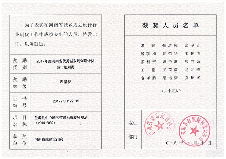 蘭考城區(qū)道路專項(xiàng)獲獎(jiǎng)證書