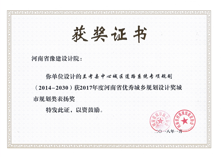 蘭考城區(qū)道路專項獲獎證書