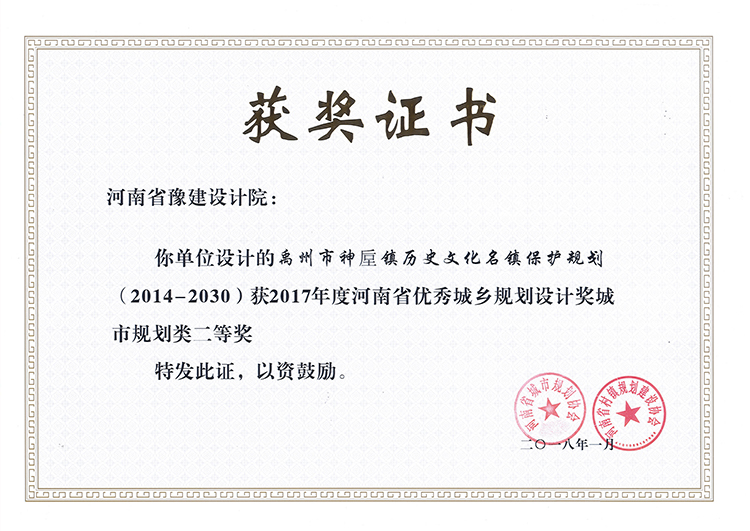 禹州神垕歷史名鎮(zhèn)獲獎證書-2017年獲獎證書-公司榮譽