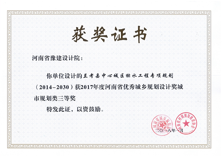蘭考中心城區(qū)排水工程專項獲獎證書-2017年獲獎證書-公司榮譽(yù)